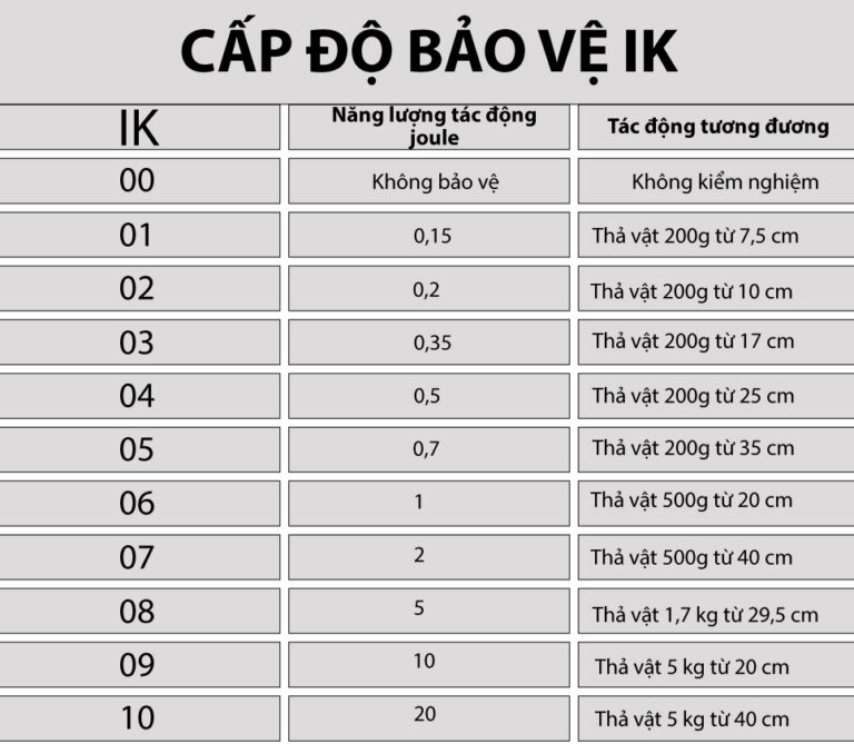 IK sẽ được biểu thị dạng IKxy với xy là số từ 00 tới 10, cùng xem bảng chỉ số IK chi tiết dưới đây nhé!