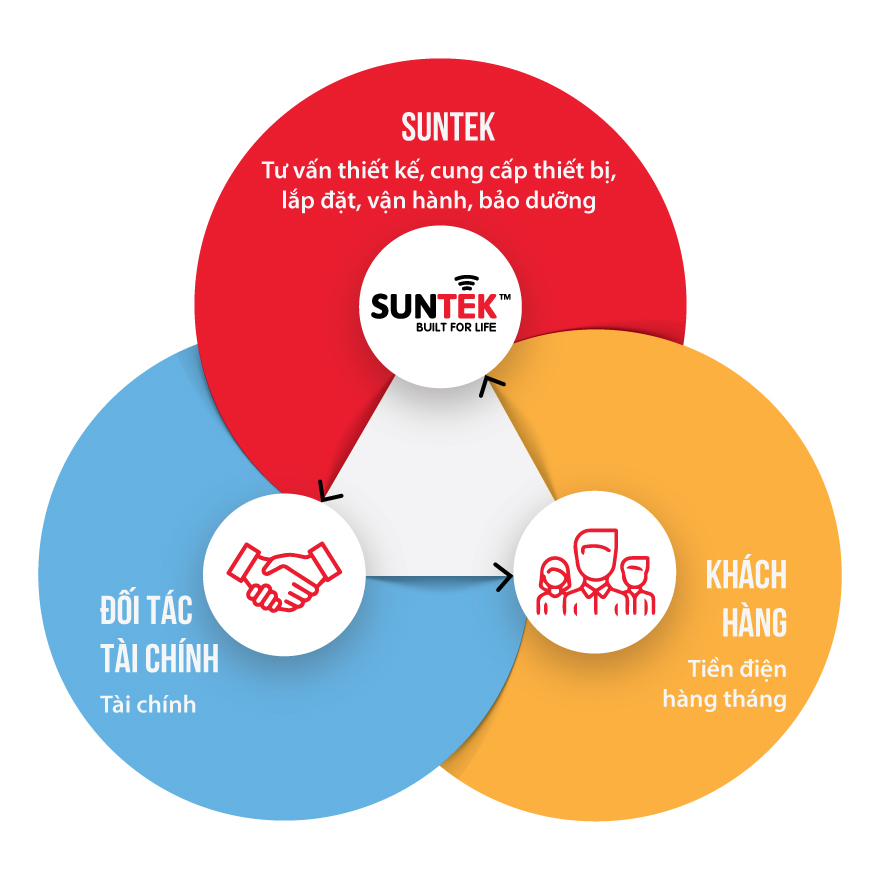 Nếu tận dụng diện tích trên phần mái của nhà kho xưởng, doanh nghiệp sẽ được lắp hệ thống Năng Lượng Mặt Trời chỉ với chi phí 0 Đồng. Toàn bộ chi phí lắp đặt hệ thống sẽ do đối tác tài chính chi trả. SUNTEK GROUP là tổng thầu EPC cho dự án, khảo sát, thiết kế, cung cấp thiết bị, lắp đặt, vận hành và bảo dưỡng cho toàn bộ hệ thống điện mặt trời. Mỗi tháng, doanh nghiệp chỉ cần trả tiền điện từ hệ thống cho đối tác tài chính với giá thấp hơn giá của EVN. Khi kết thúc hợp đồng, doanh nghiệp có quyền kí thuê tiếp hoặc thừa hưởng lại hệ thống với giá tương trưng 1 USD.